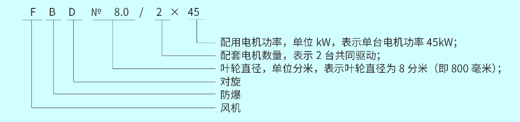 通风型号及含义如下:矿用隔爆型压入式对旋轴流局部通风机