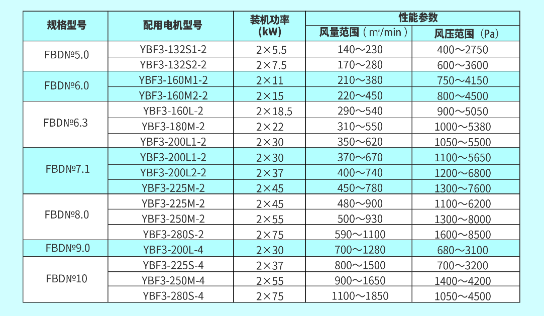 FBD系列矿用隔爆型压入式对旋轴流局部通风机性能参数表