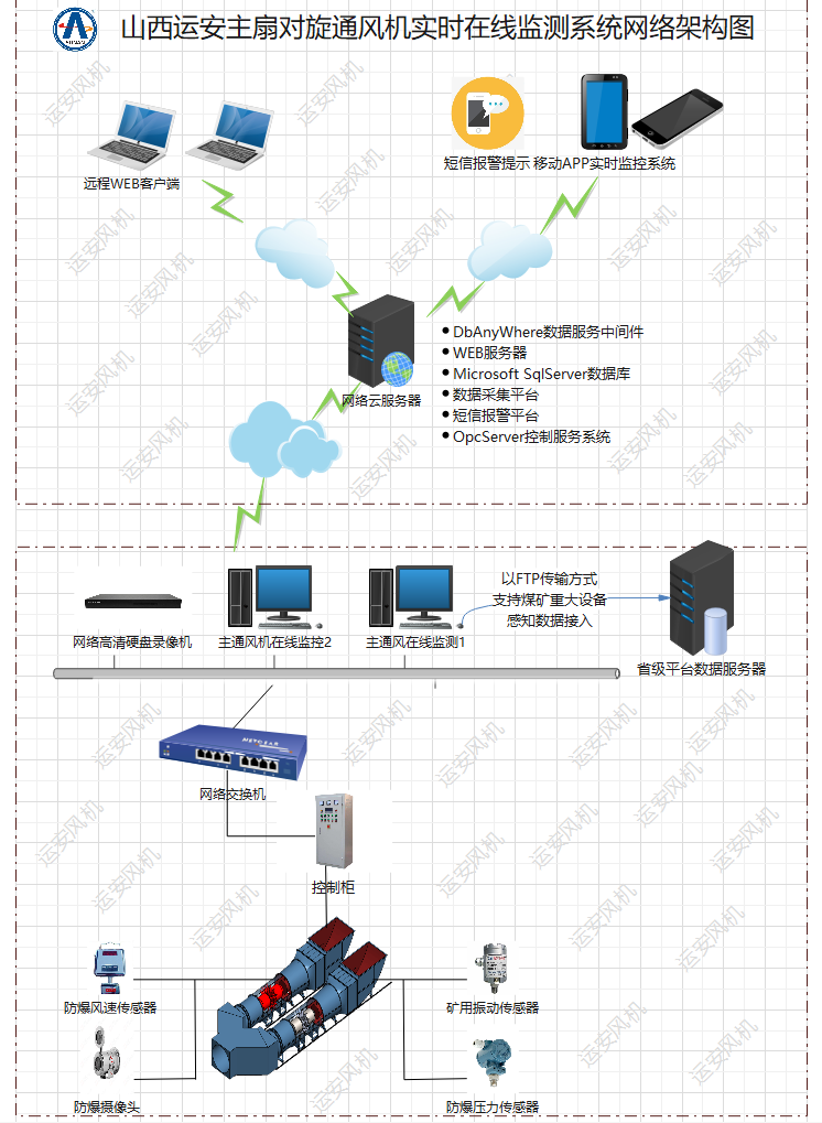 本系统以西门子PLC 作为控制核心单元、信号采集模块、触摸屏系统、上位机(SCANDA)控制系统、WEB监测平台、手机移动APP和短信报警平台构成,可实现对风机电气部分的集中监测和控制,通过顺序控制程序,可方便地实现风机的一键启动、一键倒机、自动切换功能,自动正反风等功能;支持煤矿重大设备感知数据接入功能;支持WEB网页的访问方式;通过手机移动APP可远程实现对主通风机运行状态的实时监测、控制、报警及显示,实现一键启动、一键停止、一键复位等功能;短信报警服务平台,准确及时的把所有的报警信息发送到指定的工作人员手机上,真正实现无人值守。