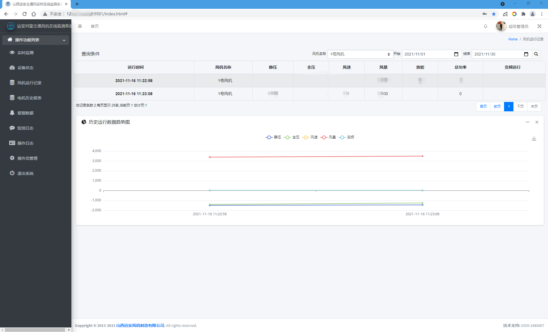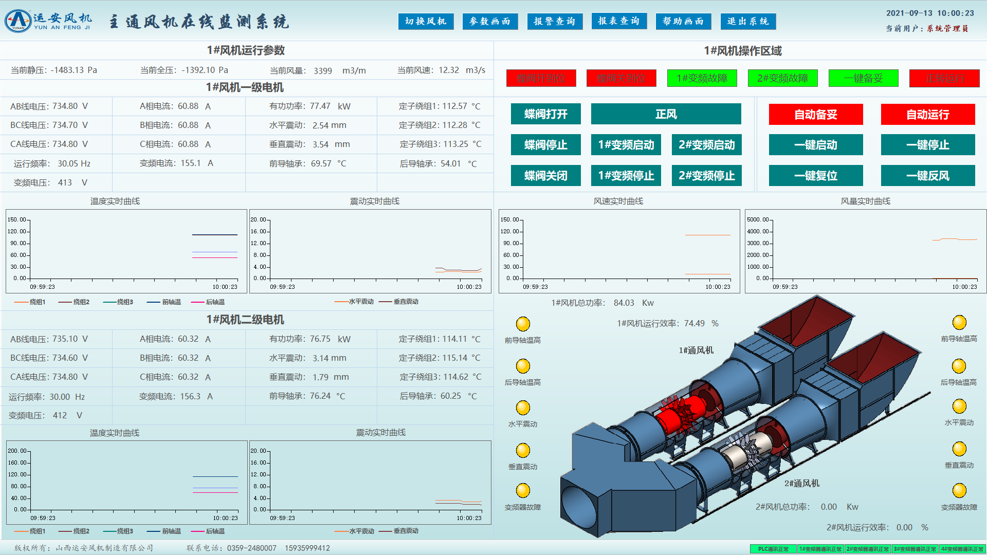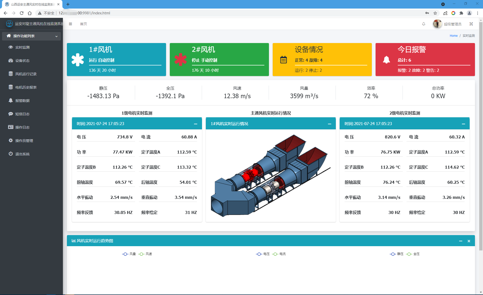 (1)监测参数包括:电机绕组温度及轴承温度;电机电流、电压、功率等参数;通风机的运行状态、风量、负压、全压、风速、通风机效率等相关参数;通风机主体及两级风叶垂直和水平方向的振动;