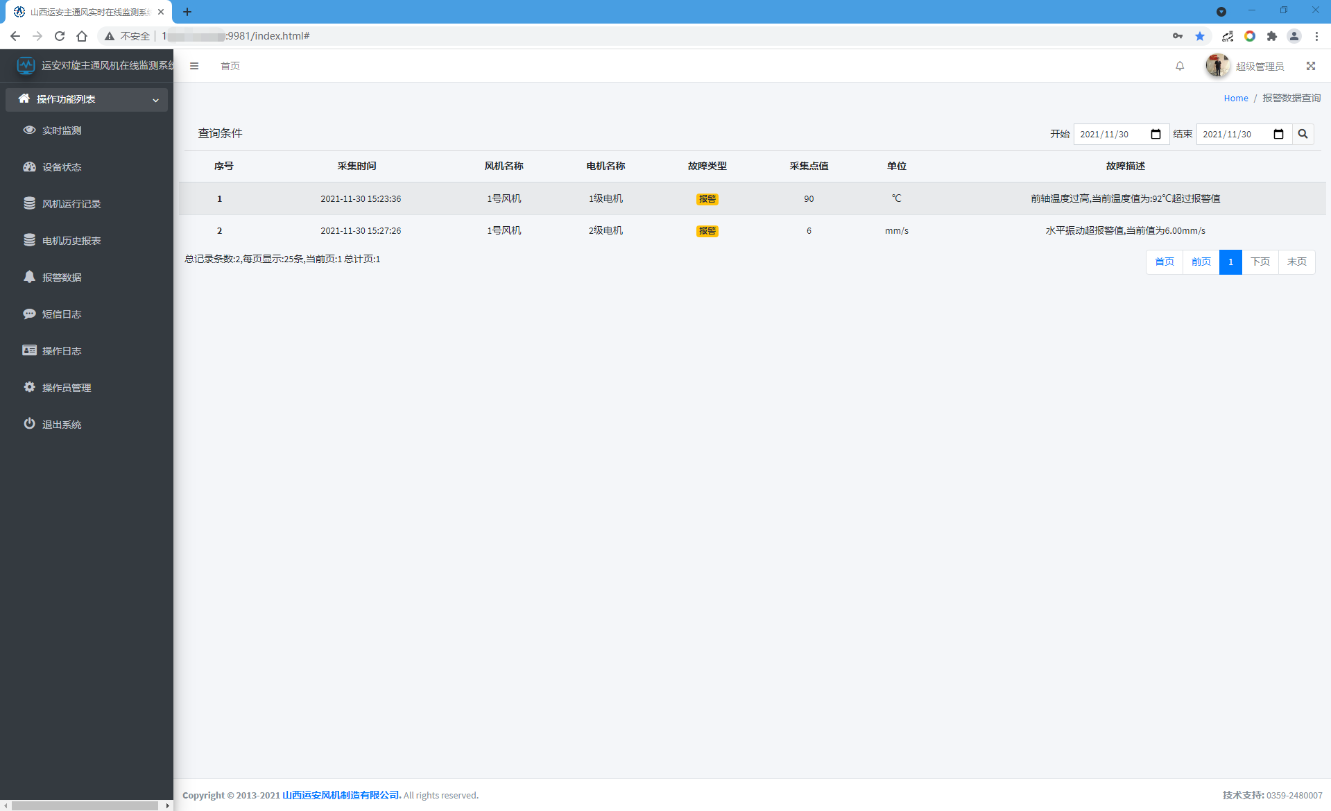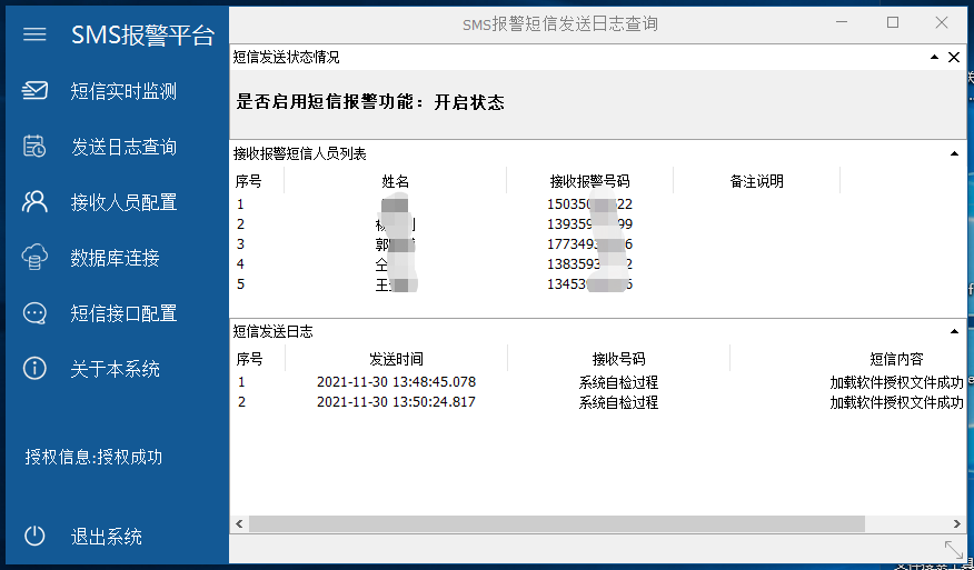 本系统通过阿里大于短信平台,能实现对机风各种类型的报警信息(故障信息、报警信息、警告信息)进行实时短信推送,通过系统设置功能,设置接收短信报警信息人员。