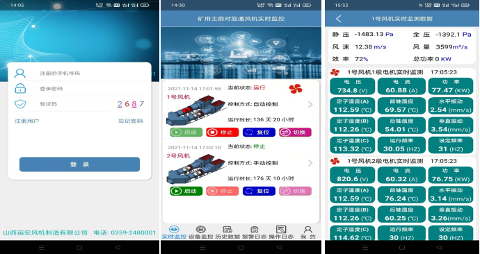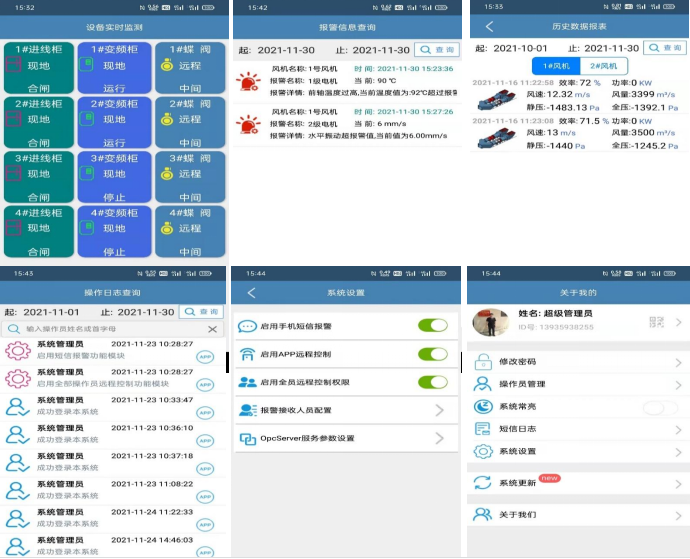 为实现随时随地的了解风机的各个电机和设备的运行情况,专门针对(Android、HarmonyOS)手机用户开发移动版的APP程序。除了能实时监测风机各项运行参数信息、进线柜、蝶阀、变频柜运行状况、历史数据查询以及风机、电机的运行历史记录和运行趋势图。还能实现一键开机、停机、复位和切换功能(注:需要具有管理员权限的操作员),普通操作员没有控制风机的权限,系统提供详细的操作日志,并能通过操作日志查询功能,查询到所有操作员的操作步骤。
