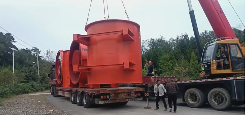 (1)通风机的整机部件包括巷道接头、集流器、一级风机、二级风机、扩散器、圆变方、消音箱、扩散塔等。风机内部道均匀光滑,集流器、整流器、鱼形管全部采用模具冷磙成型,鱼形散热管及电机底座撑板在满足足够的强度、刚度等机械性能的同时,采取圆弧过渡减阻等措施,确保风机流道均匀光滑,降低流道阻力,提高风机性能。各类支撑均采用对称结构设计,优化了流道内部结构。安装形式为两台风机并列卧式布置;风机随机安装有测压环等性能测试接口,用来测量风机负压和流量等参数,可与测压传感器连接,用来测量风机动、静压和流量。风筒外壁上设置测振座,预留振动传感器安装接口。风机各部位的设计、制造应确保能承受各种工况条件下运行的强度需要,轮毂材质不低于 Q345,轮毂外圆采用球面结构,轮毂辐板厚度不低于 35mm。风机壳体材质采用 Q235,主机外壳所用钢板厚度不小于 8mm,电机底座钢板厚度不小于 25mm,保护筒内筒加工成型,加工后厚不低于 15mm。风机各部位的设计、制造应能承受各种工况条件下运行的强度需要。轮毂焊接完成后整体退火,轮毂、叶片等主要部件需进行无损探伤并提供检验报告,保证质量可靠性。通风机焊缝整齐美观无焊接缺陷,风机关键焊接件均经热处理消除残余应力。